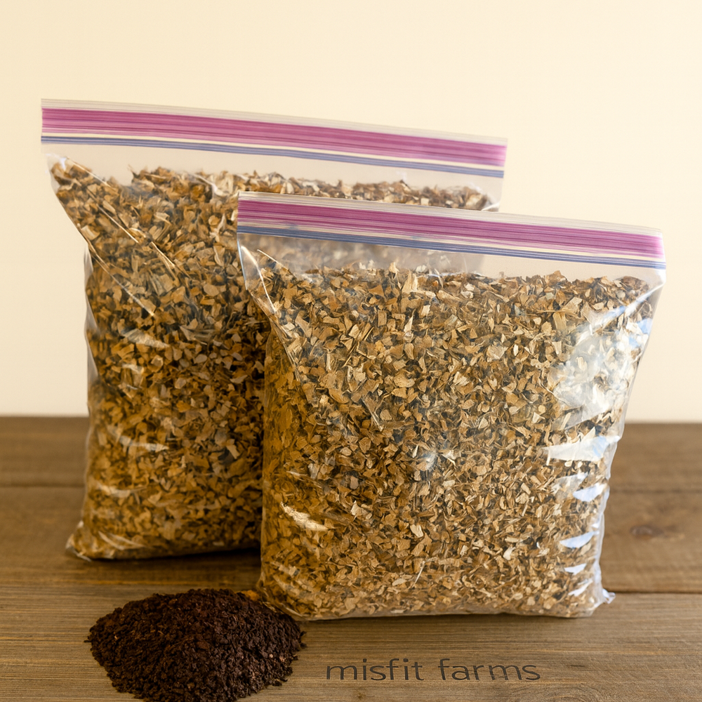 At Misfit Farms, we reuse and upcycle everything we can; our cardboard is no exception. In fact, shredded cardboard is a necessity when setting up a new worm farm and after you harvest castings as it provides a carbon food source, warm bedding, and helps balance pH levels. With isopods, cardboard is a natural source of cellulose and helps to even out moisture levels in their enclosure. With our carbon-rich bioactive substrate, we combined the best of both worlds; shredded cardboard and our bioactive soil composed of manure, compost, earthworm castings, kelp meal, and a dash of molasses (gets the microbes going crazy). We make each batch to order to ensure you get live bacteria (bioactive), so each bag will look different. Available in one or two-gallon increments.