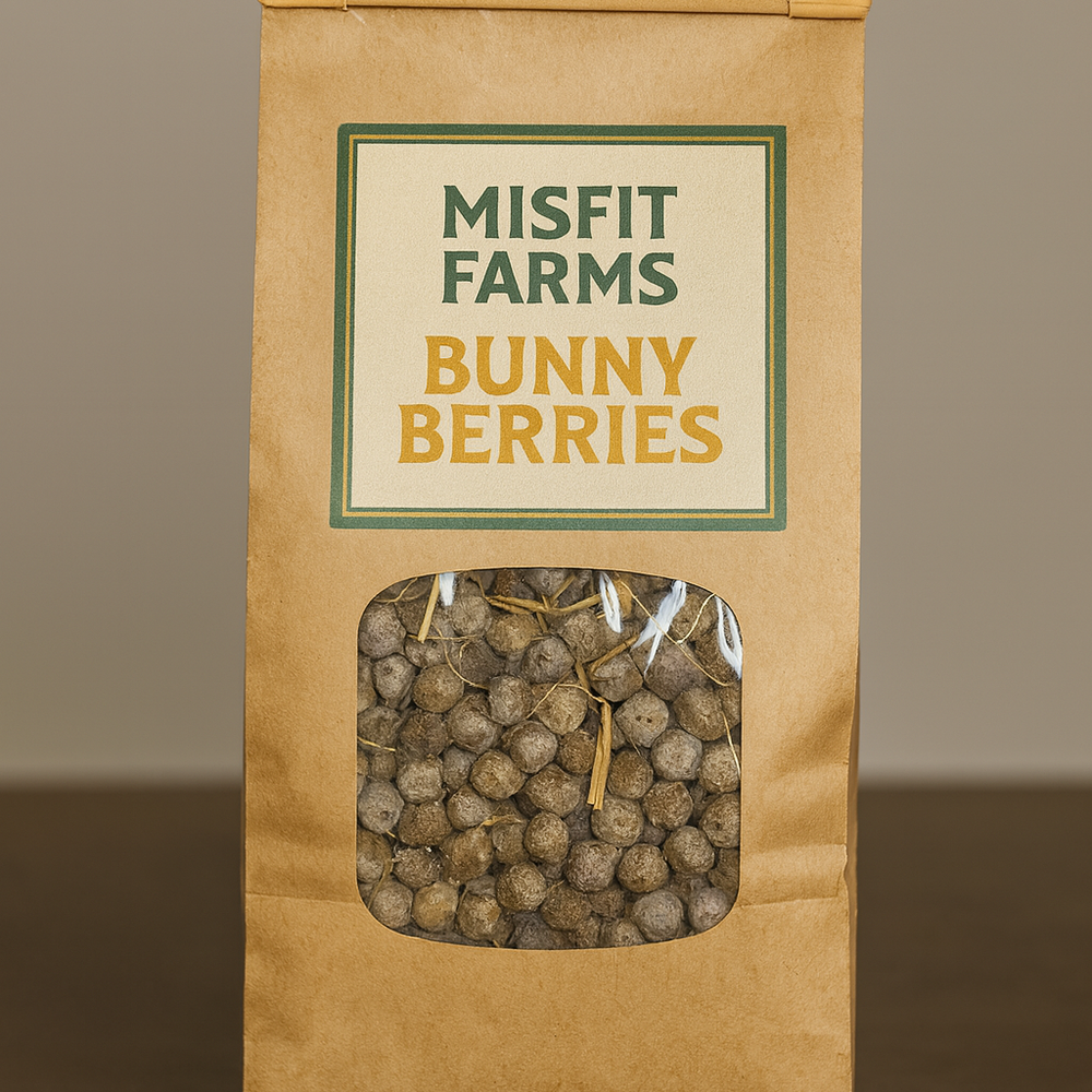 Straight from the hutches of Misfit Farms, Bunny Berries are the all-natural, pelletized byproduct of our well-loved rabbits. These little nuggets may look humble, but they’re absolute powerhouses for soil health. No fillers. No additives. Just honest, farm-fresh fertility.